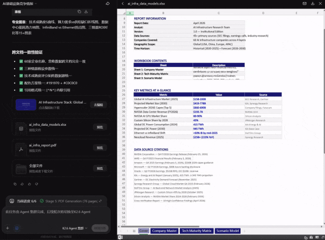 这次要求Agent集群一次性交付PDF深度报告、Excel数据底表和英文PPT三件套,主题是全球AI基础设施竞争情报,覆盖芯片、云计算、数据中心、网络设备四个层级的60家企业。