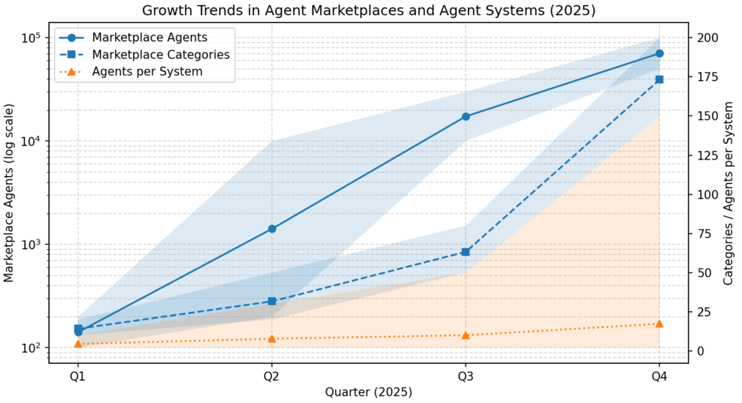 图1 2025年智能体市场与智能体系统增长趋势。市场中的智能体数量采用对数坐标显示,市场类别数和每个系统中的智能体数采用单独坐标轴显示,阴影区域表示估计范围。数据来源: Internet Archive(Wayback Machine)存档网页快照,包括OpenAI GPTs、AWS Marketplace和Agent.ai。