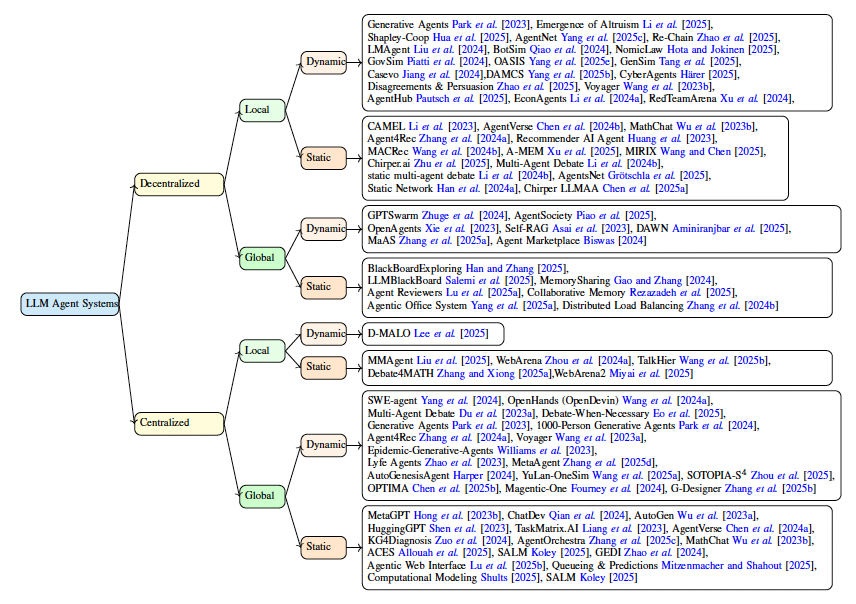 为更直观地展示这套分类框架,作者将现有大规模智能体系统按照「拓扑(topology)—记忆范围(memory scope)—更新行为(update behavior)」三个维度组织成一张层级结构图。通过这张图可以看到,不同系统虽然都属于多智能体范式,但它们在中心化或去中心化、全局记忆或局部记忆、静态或动态更新上的选择并不相同。这些结构差异进一步决定了系统在协调效率、扩展性、鲁棒性和长期行为上的不同表现。
