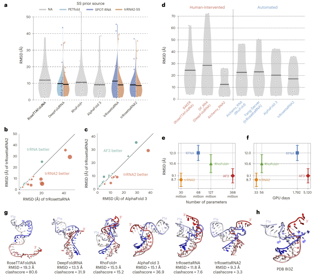 在具体案例中,trRosettaRNA2能够正确预测复杂RNA结构的空间构型,并显著减少结构冲突问题,说明其不仅精度高,而且物理合理性更强。