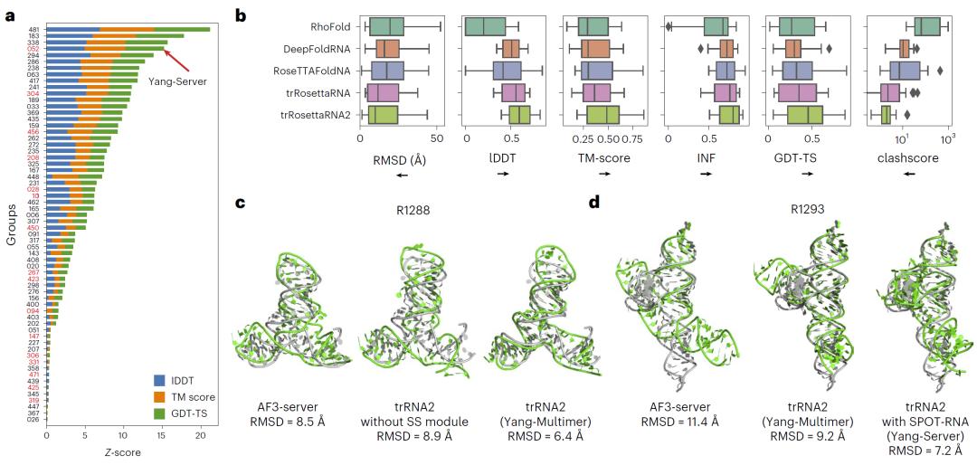 在CASP16评测中,Yang-Server(基于trRosettaRNA2)在自动服务器中排名第一,在所有参赛队伍中位列前列。