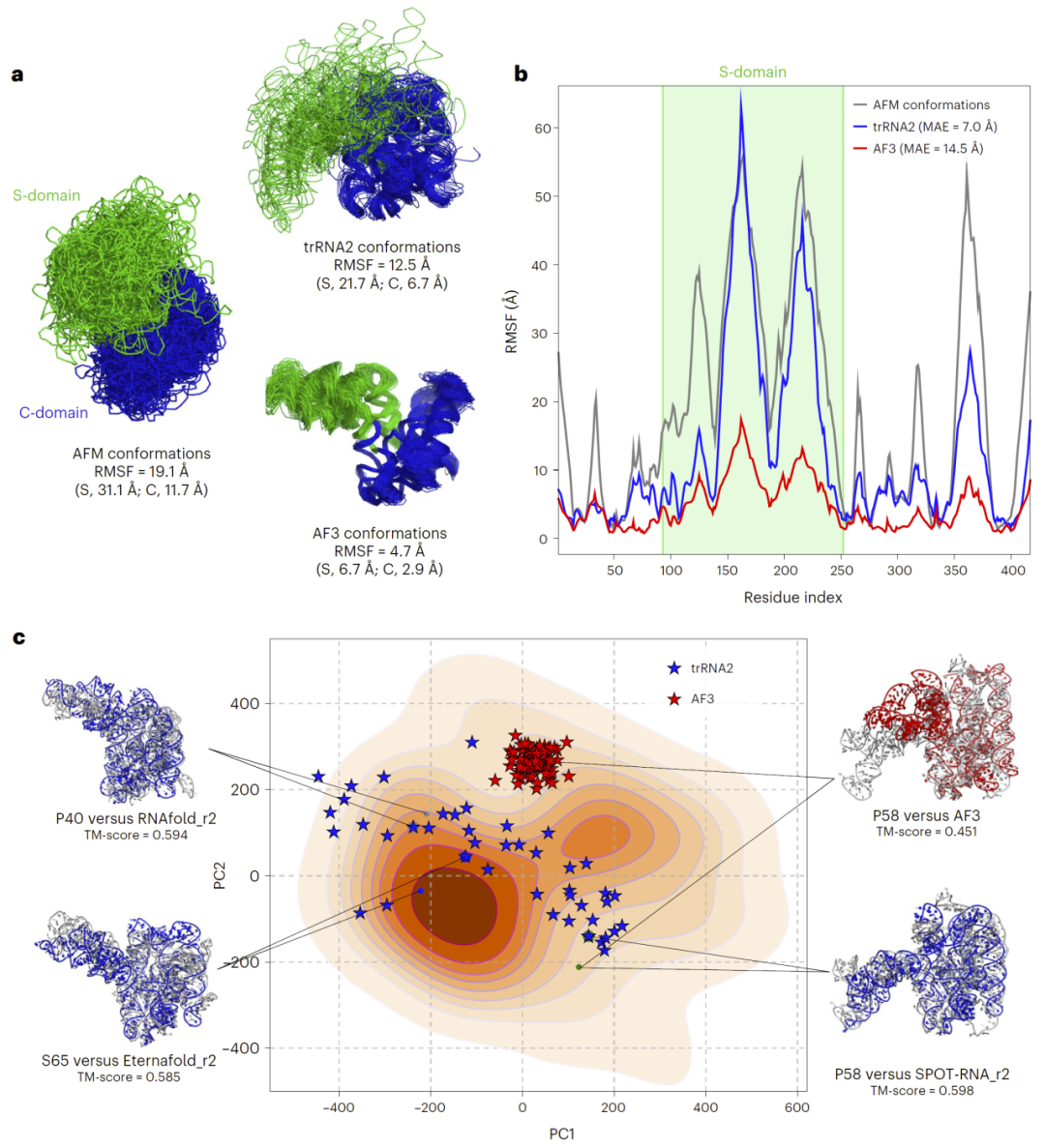 在RNase P RNA案例中,模型生成的构象集合在动态性上与实验数据高度一致,尤其是在高度可变的结构区域表现出良好一致性。