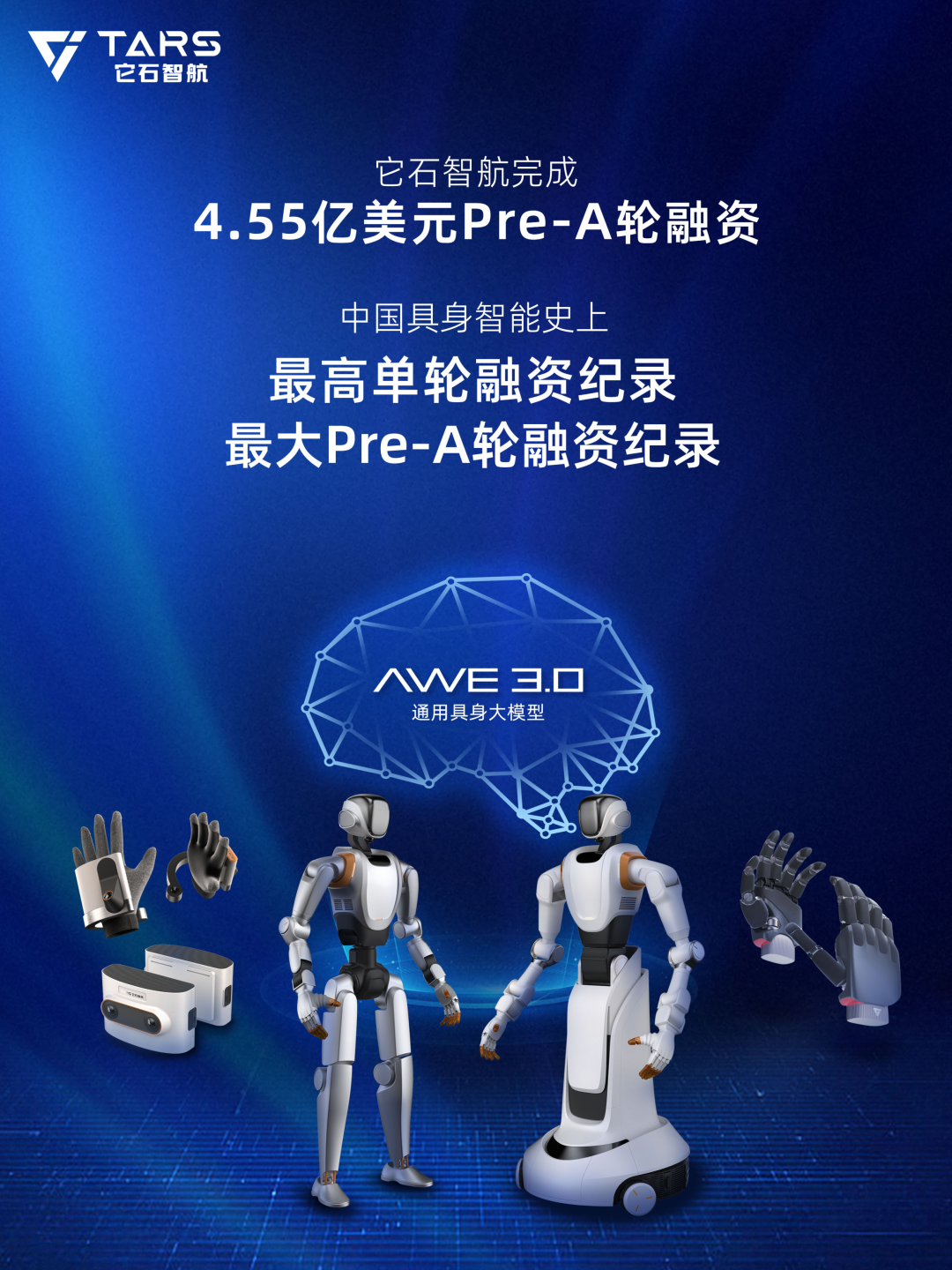 4月16日,具身智能领军企业它石智航宣布完成4.55亿美金(约超30亿人民币)Pre-A轮融资,同步打破中国具身智能有史以来最高单轮融资纪录和最大Pre-A轮融资纪录。