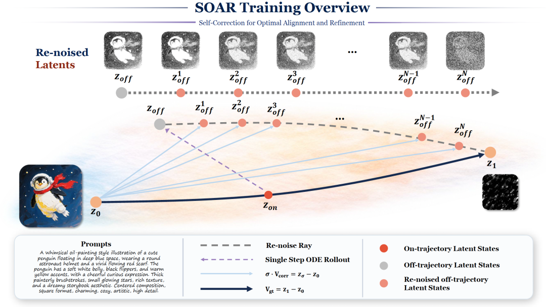 SOAR不依赖奖励模型、不用偏好标注、不靠负样本,直接从训练数据中挖掘轨迹级纠正信号,让模型在去噪过程中学会自我反思和纠偏——为视觉生成模型的后训练提供了一条全新的路径。