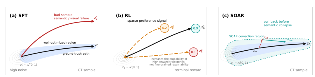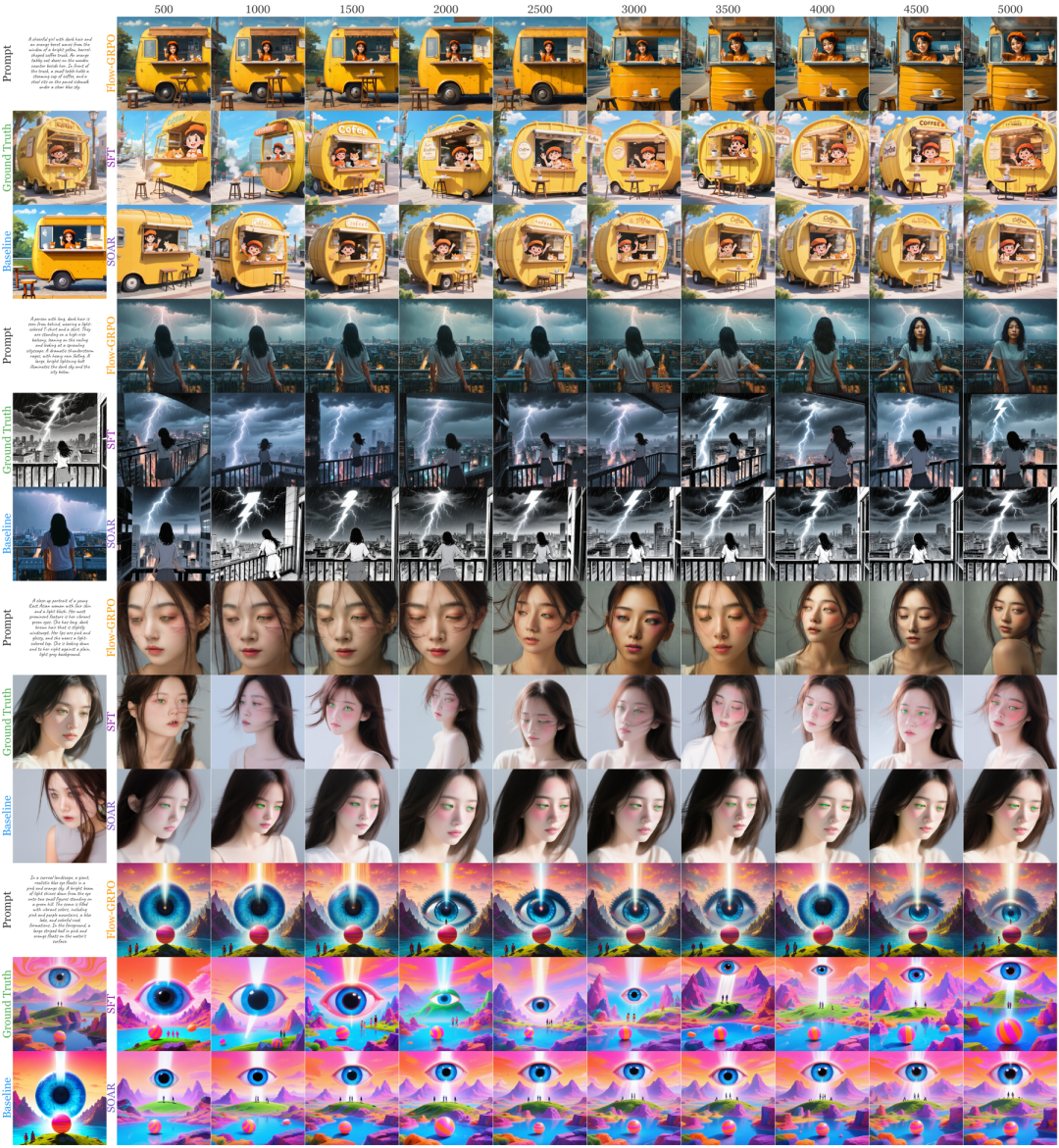 SOAR可以先把模型的轨迹稳定性拉到一个更高的基线——语义不崩塌、结构不走形、文字不乱码——在此基础上再接入RL做偏好探索,模型就能在一个更安全的区间内进行风格调整和质量优化。