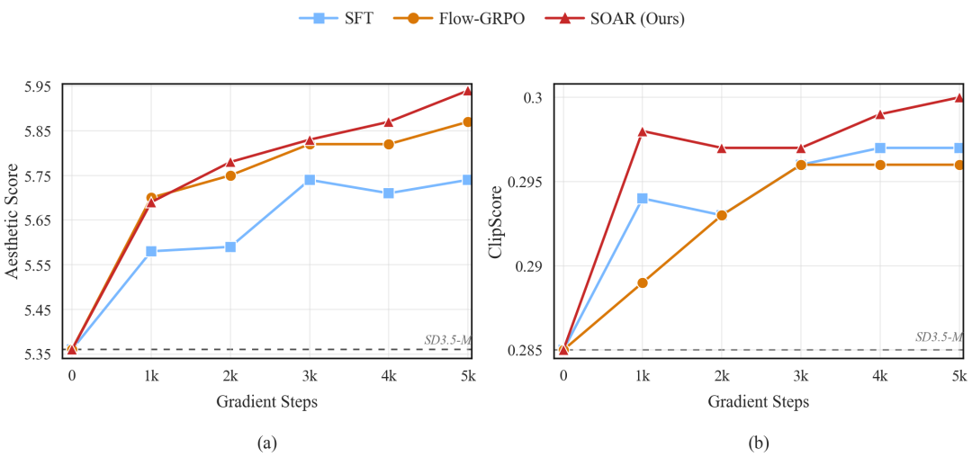 在高美学和高CLIPScore子集上的专项对比中,SOAR不仅在目标指标上呈现稳定的单调提升,最终数值还优于直接优化对应奖励的Flow-GRPO(Aesthetic 5.94 vs 5.87;ClipScore 0.300 vs 0.296)。换言之,不用奖励模型的SOAR,比用奖励模型做RL的Flow-GRPO效果更好——这正是更高数据利用率带来的红利。
