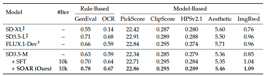 △表1:SOAR与SFT在SD3.5-Medium上的指标对比。SOAR在所有维度上均获得提升,且无需奖励模型