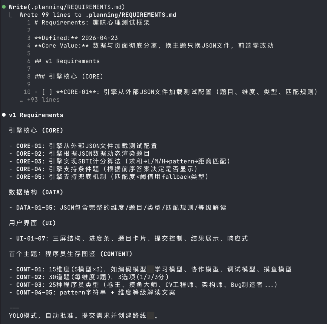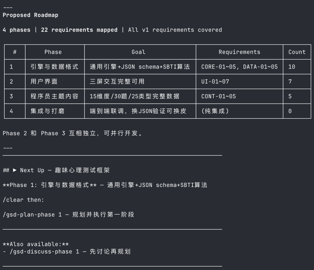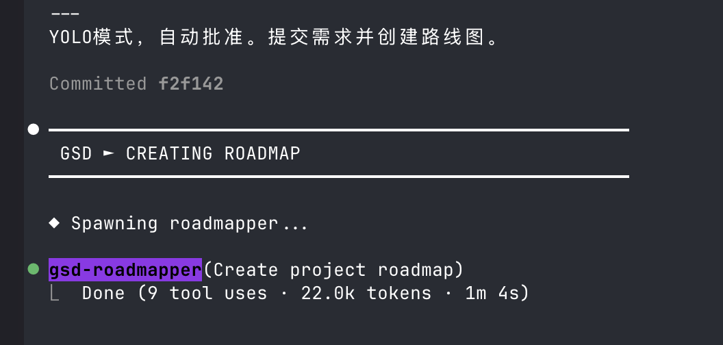 再下一步是自动创建路线图,这一步可以看出,自动生成子智能体“gsd-roadmapper”也是成功的。