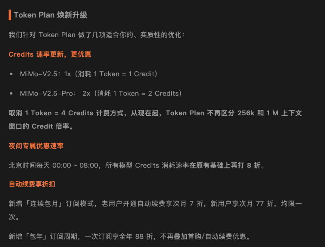 随着新模型发布,小米Token Plan额度上还是有所调整。