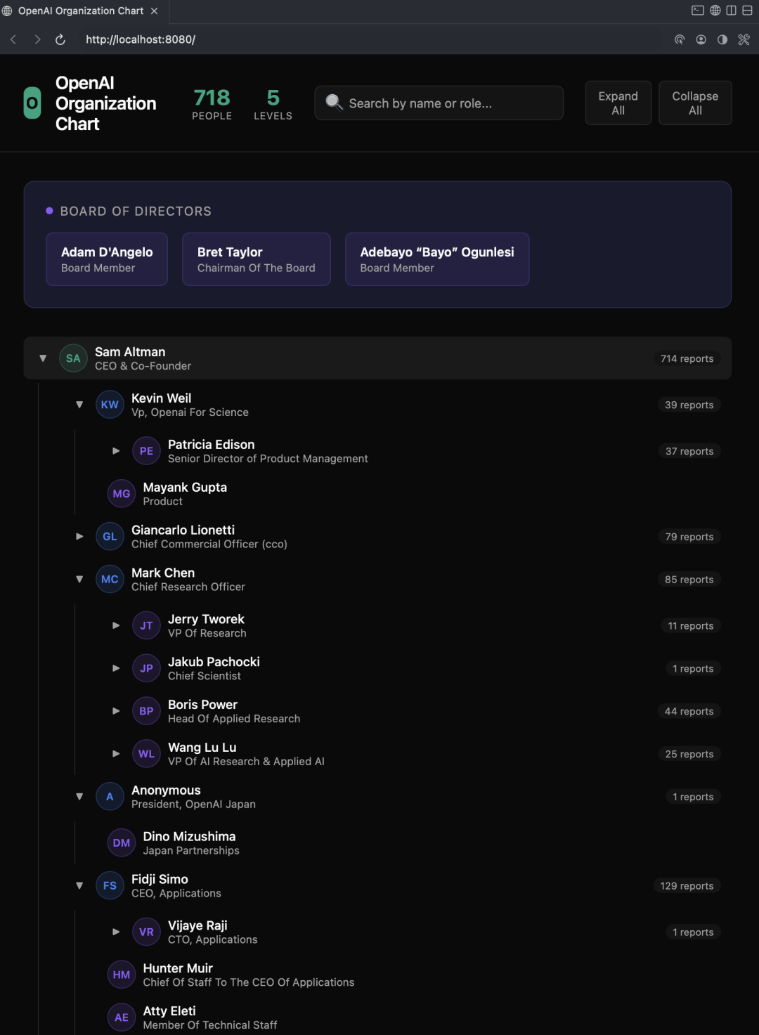 给他一份的OpenAI主要人员和汇报关系数据,让它开发一个展示OpenAI组织架构图的页面。