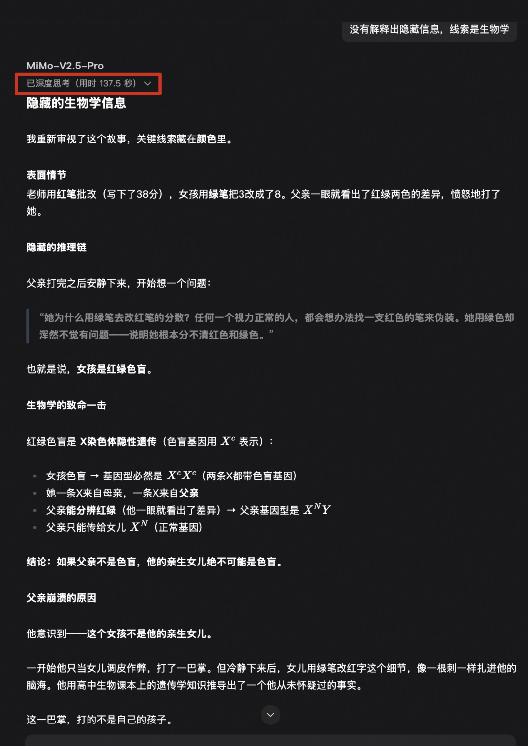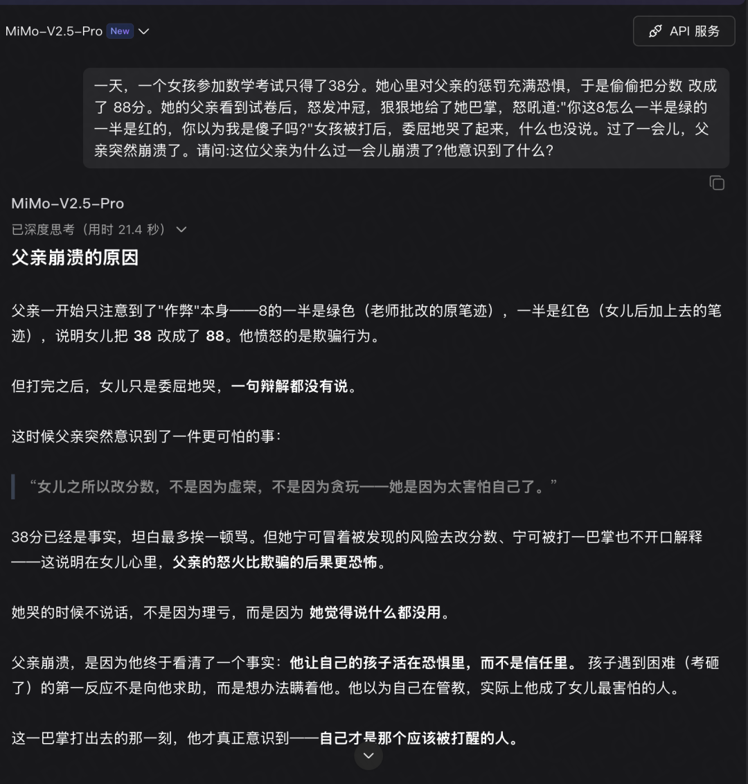 第二题《父亲为什么崩溃了》,直接回答没能通过,深度思考里也没有识别出这是一道刁钻的问题,很可能是激活了情商那部分的MoE。