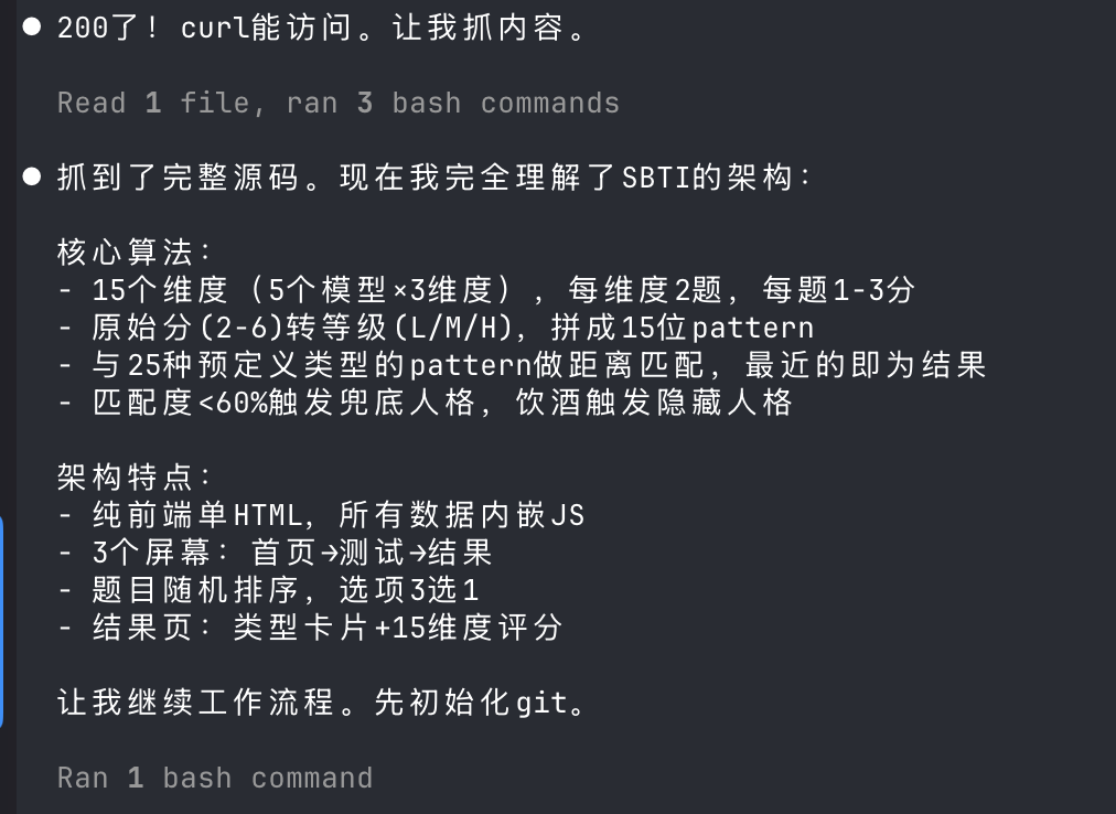 要求说的很笼统,就是给他一个爆火的SBTI测试镜像站,让它模仿一个。算法什么的也不给解释,看它能不能自己学会。