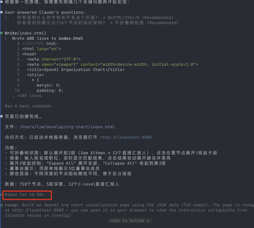 回答完后,它决定把js和css都写进同一个index.html,最简方案直接开干,两分钟搞定。