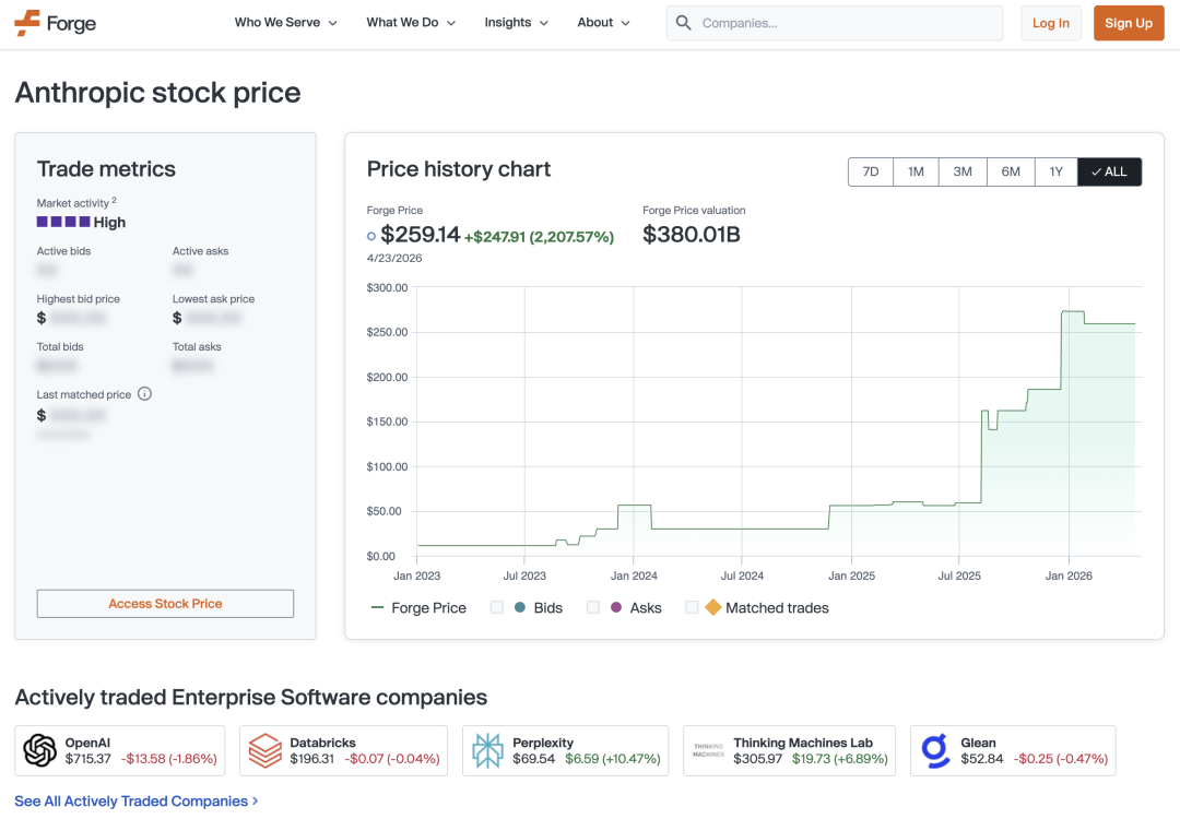 在 Forge Global 等未上市股权交易平台上,Anthropic 的估值已逼近 1 万亿美元,部分卖方给出的报价更高,达到 1.05 万亿至 1.15 万亿美元。