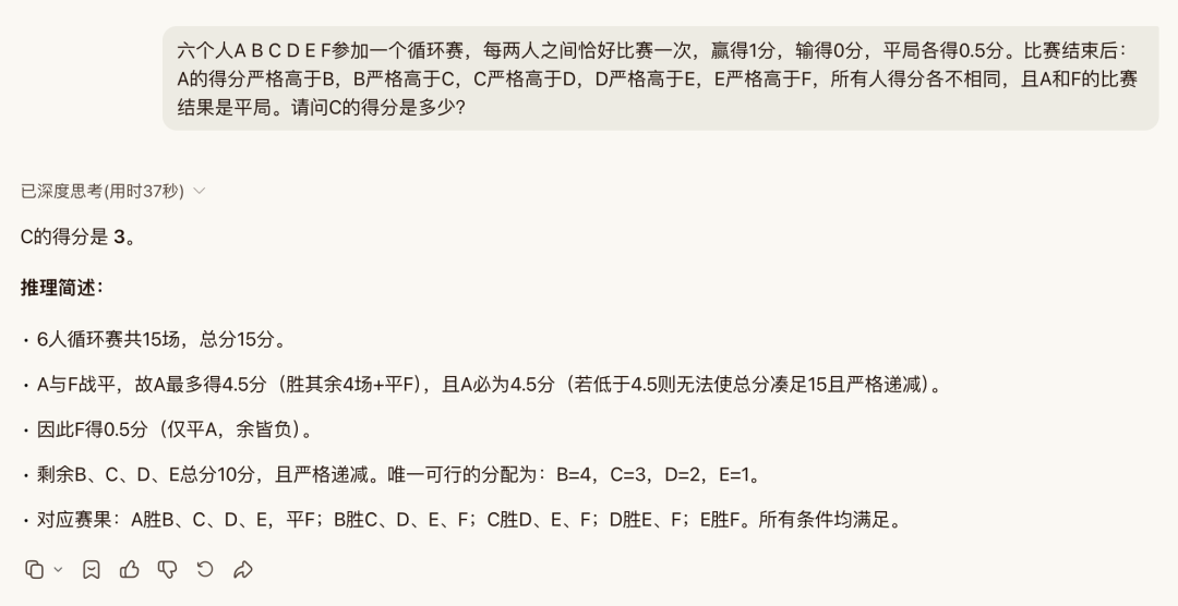 值得说的是它处理“A和F平局”这个条件的方式,没有被这个反直觉的设定绊住,直接从总分15分倒推A只能是4.5,然后F自然锁定为0.5,剩下四人的分配唯一确定。
