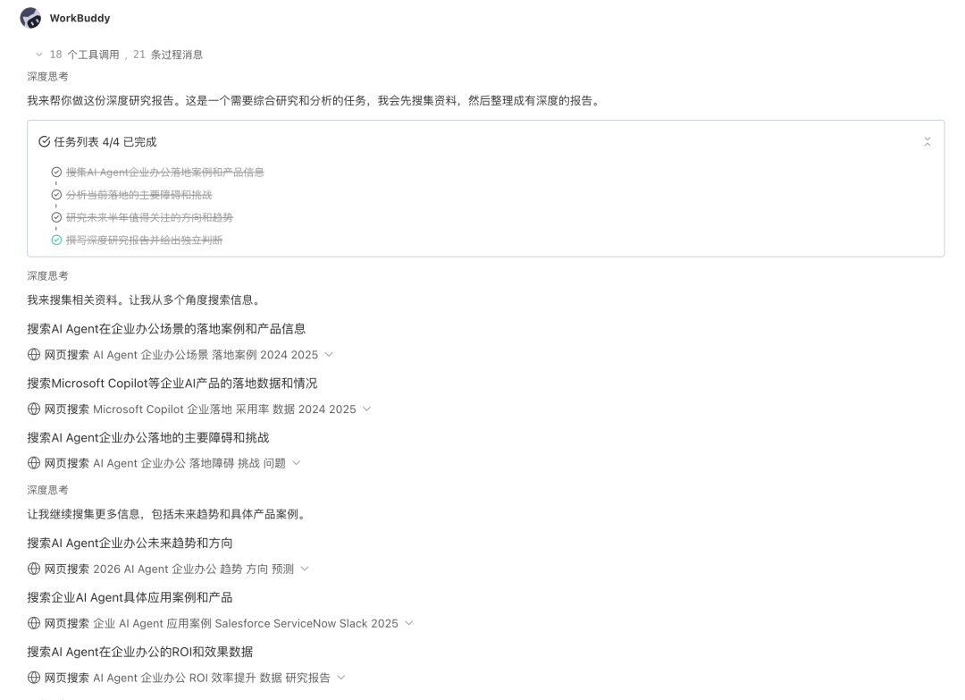 整个过程18次工具调用、21条过程消息,没有一次等待人来指示下一步。
