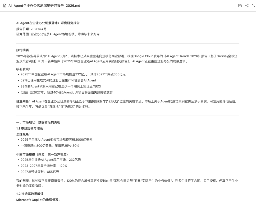 帮我做一份关于“AI Agent在企业办公场景落地”的深度研究报告。自己搜集资料,找到真实的产品案例和数据,识别目前落地的主要障碍,给出你认为接下来半年最值得关注的方向。不要只罗列信息,要有自己的判断。