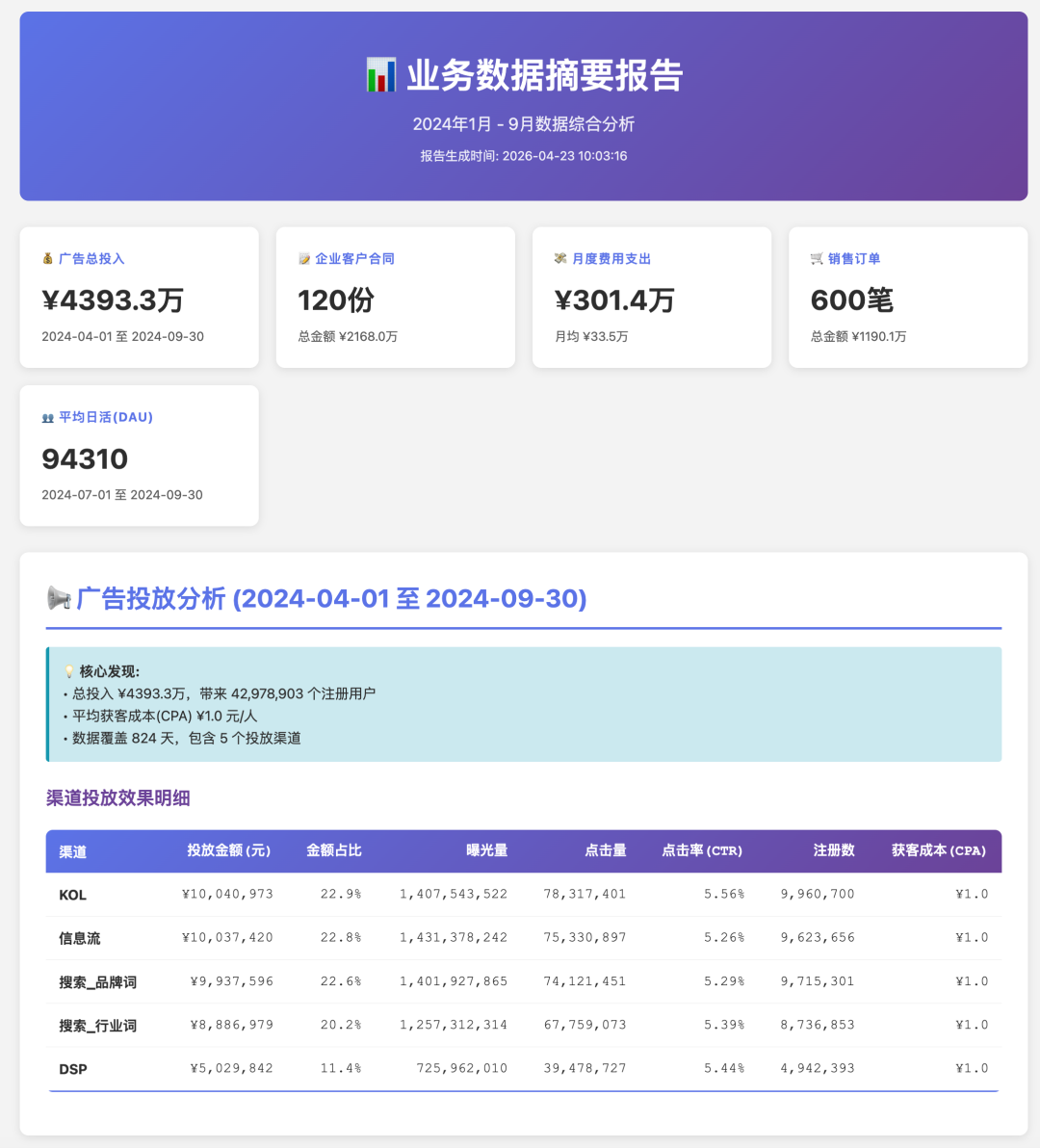 脚本跑完,HTML也就有了,在浏览器里打开就能用,有核心指标卡片、有分渠道明细表,样式也干净。