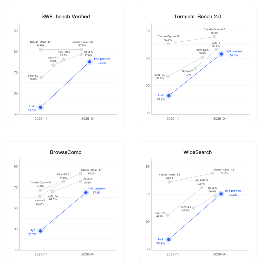 智能体能力方面,Hy3 preview在ClawEval和WildClawBench等评测中同样表现突出。