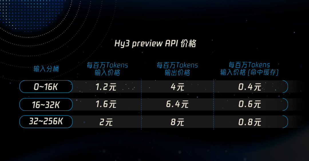 价格方面,在腾讯云大模型服务平台TokenHub上,Hy3 preview输入价格最低1.2元/百万tokens,输入命中缓存价格0.4元/百万tokens,输出价格最低4元/百万tokens。