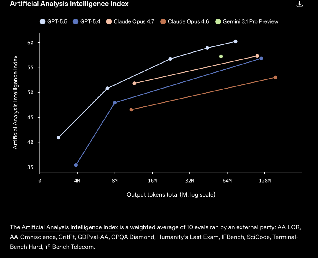 GPT-5.5获得相同的分数比Claude Opus 4.7和其他模型消耗token更少。