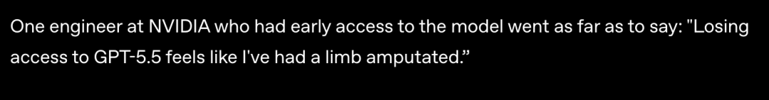 其中有一位英伟达工程师,他在早期测试结束后短暂的失去了GPT-5.5的访问权限,然后说了这样一句话: