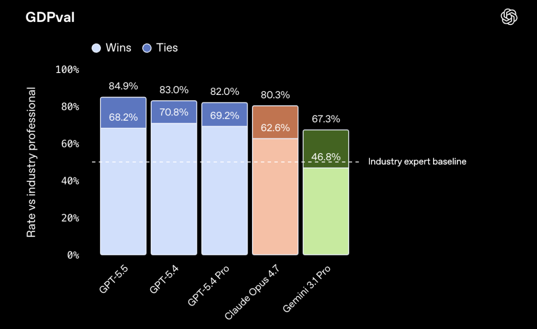 在知识工作基准测试GDPval上,GPT-5.5拿到84.9%,比Claude Opus 4.7高出4.6个百分点。