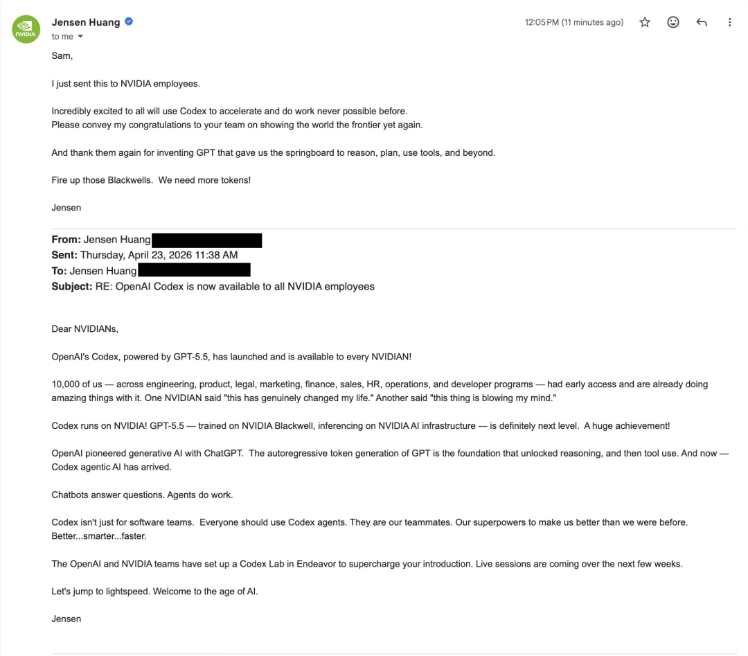 第二,推广Codex到英伟达全公司,奥特曼还晒出了与老黄的邮件。