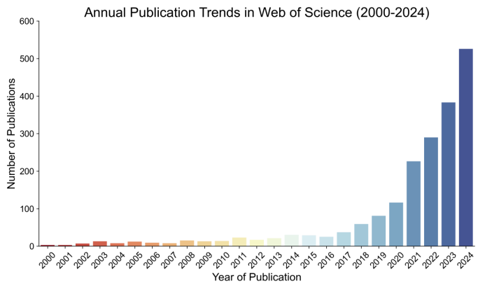 图1. 2000年至2024年间Web of Science数据库中药物递送领域AI相关出版物数量的变化统计。