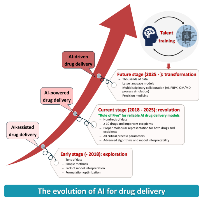 澳门大学欧阳德方博士团队系统性地梳理了AI技术在药物递送领域的演进历程,从早期的简单模型到当前的先进算法,全面覆盖了配方优化、关键参数预测及从头材料设计等多元应用场景。为增强AI应用的可靠性与实用性,该团队提出了适用于药物递送领域的"五规则"(Rule of Five, Ro5)以及一套全面的指导原则,为研究人员提供清晰而系统的实践框架。此外,本综述还深入探讨了未来发展方向,包括大型语言模型的潜在应用、跨学科合作机遇、专业人才培养等,为推动AI驱动的药物制剂开发范式转变提供了前瞻性视角。