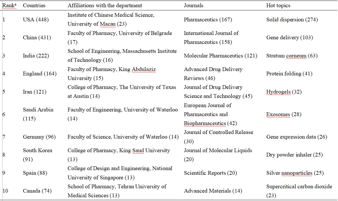 表1. Web of Science数据库中药物递送领域AI相关出版物的排名统计(截止至2024年底)