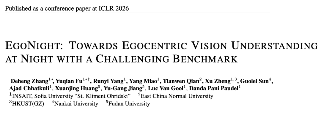来自INSAIT、华东师范大学、港科大(广州)、南开大学、复旦大学等机构的研究者提出EgoNight基准,系统聚焦夜间第一人称视觉理解这一长期被忽视的问题,被ICLR 2026收录。