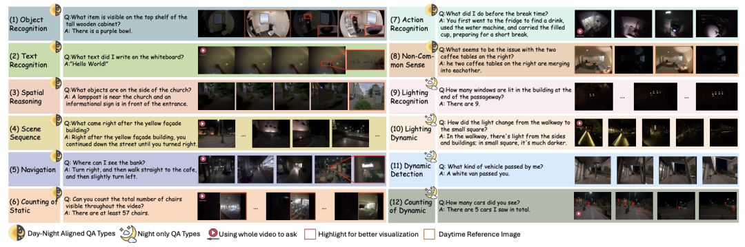 第一类是可以做昼夜直接对比的paired QA,例如物体识别、文字识别、动作识别等;这些任务能够直接告诉我们,同一个场景、同一类问题,在白天与夜晚之间会掉多少。