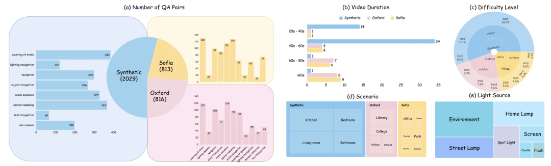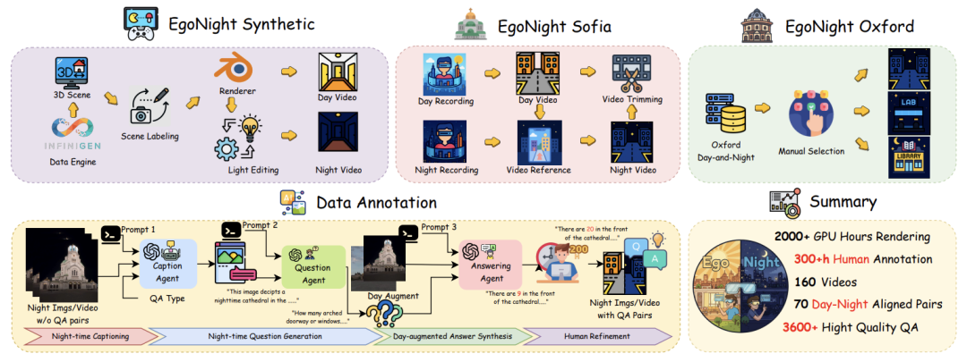 围绕这一思路,EgoNight包含三个数据子集:真实采集的EgoNight-Sofia、由Blender/Infinigen构建的EgoNight-Synthetic,以及来自Oxford Day-and-Night的夜间片段。