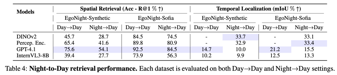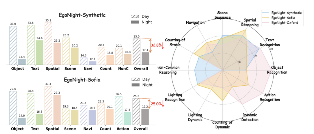 也就是说,EgoNight实际上在同时追问三个层面的问题:模型是否还能看清、还能对齐、还能推理。