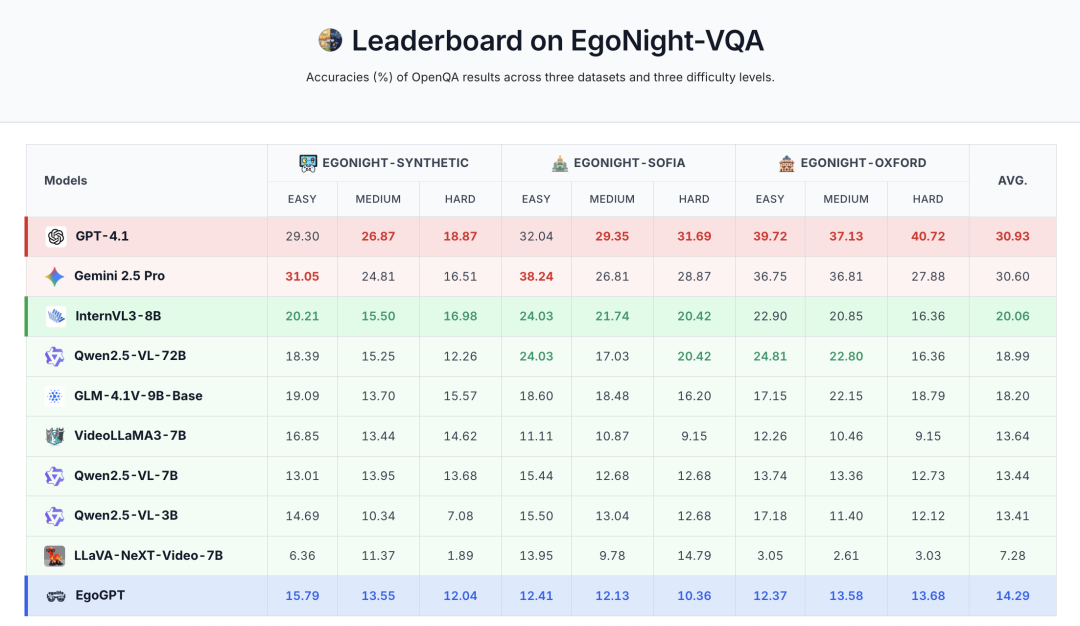 项目主页公布的榜单很能说明问题:在EgoNight-VQA 上,GPT-4.1和Gemini 2.5 Pro的平均准确率分别为30.93%和30.60%,已经是当前表现最好的模型之一,但距离“可靠可用”仍有相当距离。
