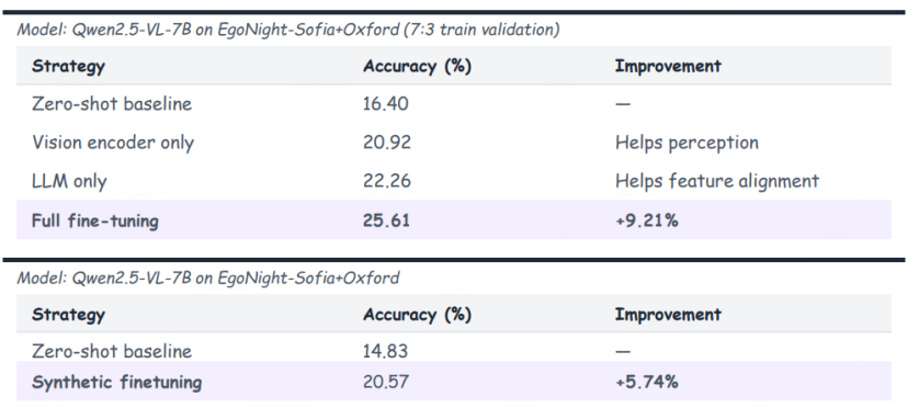 而调语言模型部分,则能同时改善感知与推理,说明夜间理解不仅受视觉退化影响,也和模型如何调用语言先验密切相关。