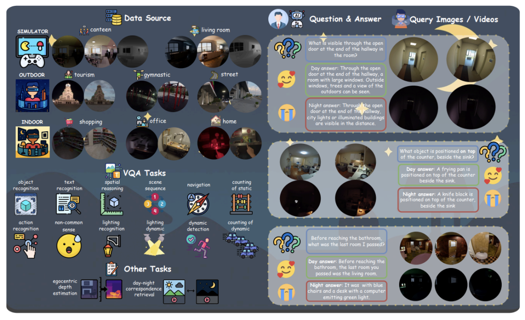 它把昼夜对齐视频、夜间问答评测、深度估计与跨光照检索放进同一套benchmark中,让研究者能够真正回答: