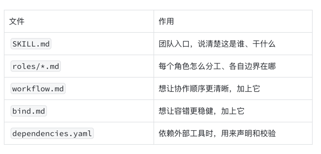 <team-skill-name>/├── SKILL.md ← 这个团队叫什么、干什么、成员有谁├── roles/ ← 每个成员角色各自负责什么│ ├── <role-a>.md│ └── <role-b>.md├── workflow.md ← 大家怎么配合、执行顺序是什么├── bind.md ← 遇到问题怎么处理、边界在哪里├── dependencies.yaml ← 依赖哪些外部工具└── examples/ | templates/ | assets/ ... ← 自由扩展