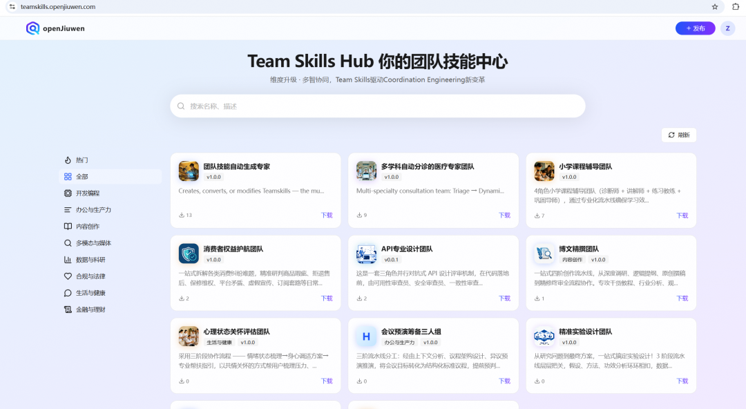 openJiuwen提供了Team Skills Hub平台,支持上传、检索、下载、维护团队技能。