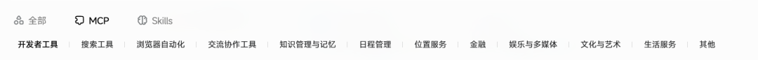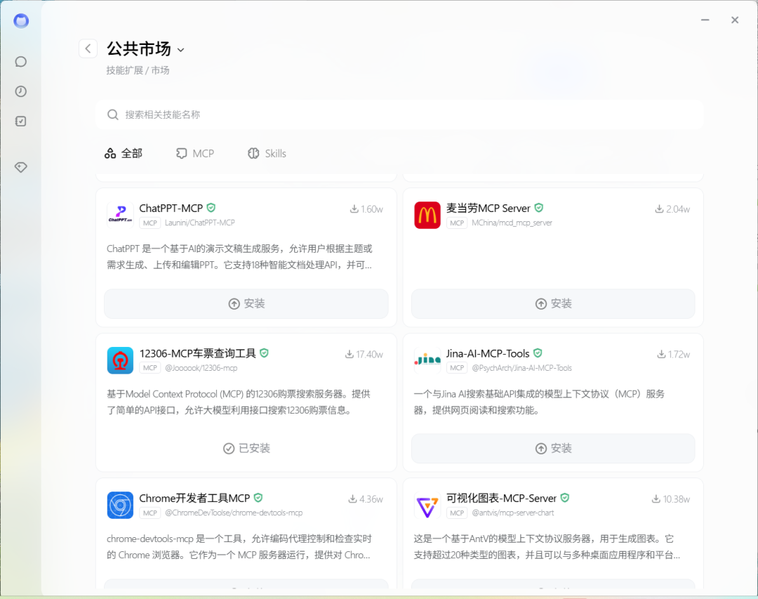 点击左侧导航栏的“技能”,你可以看到丰富的技能插件,除了常见的网页抓取或搜索,还有麦当劳MCP工具和12306车票查询。