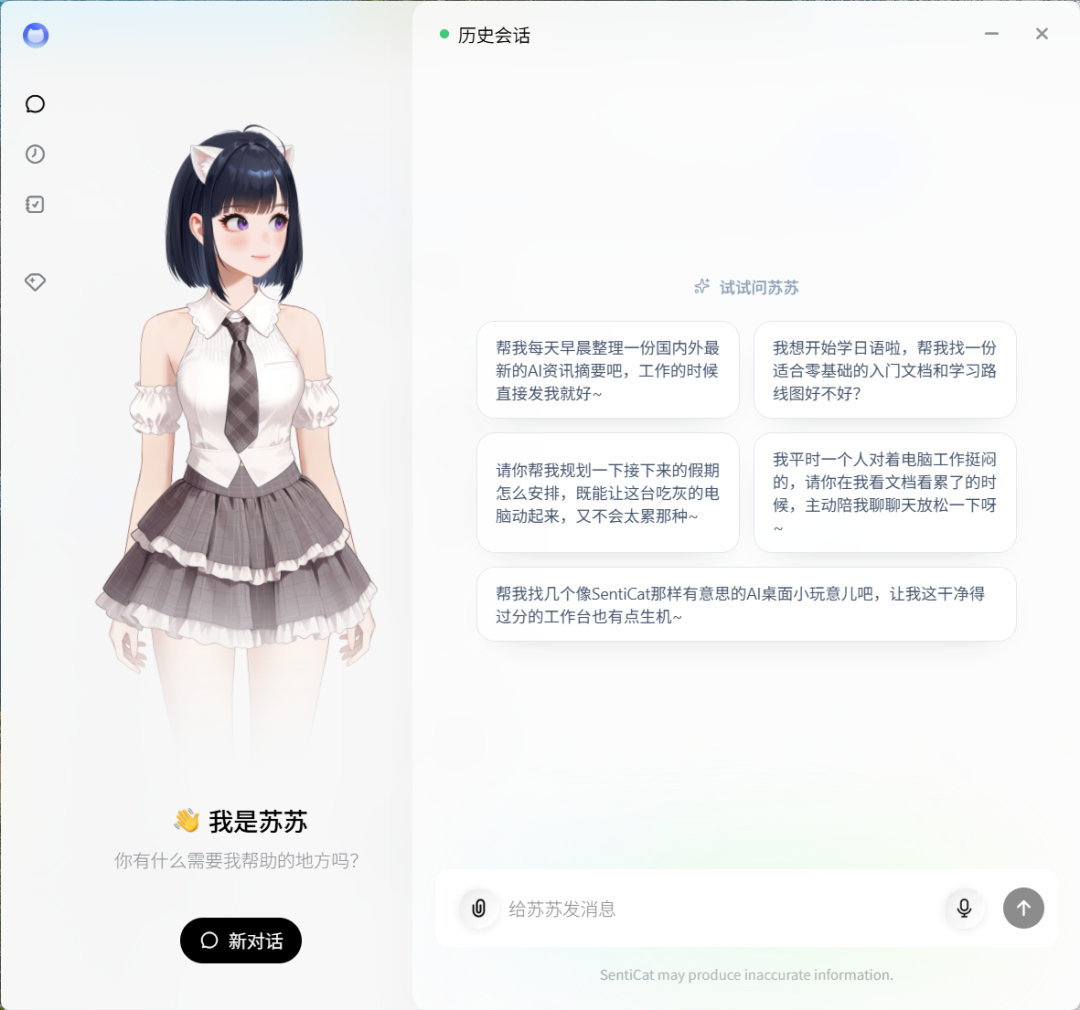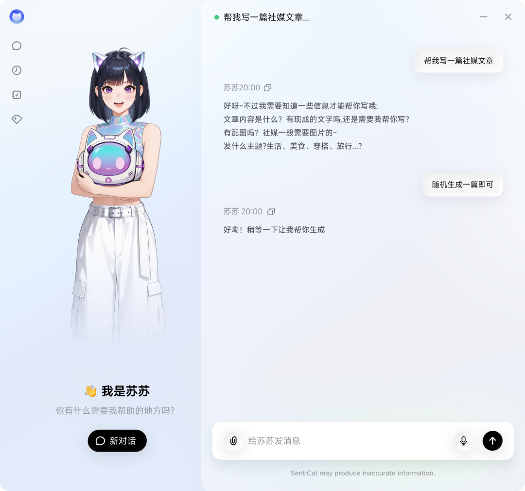在SentiCat中,SUSU和AI小猫共享同一个聊天框,分工明确:SUSU负责陪伴对话,AI小猫负责任务执行。