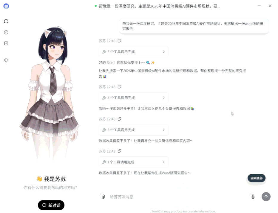 SentiCat拥有三大核心能力:办公自动化、深度研究、代码开发。不管是写报告、做PPT,还是帮你写代码、找bug,都不在话下。