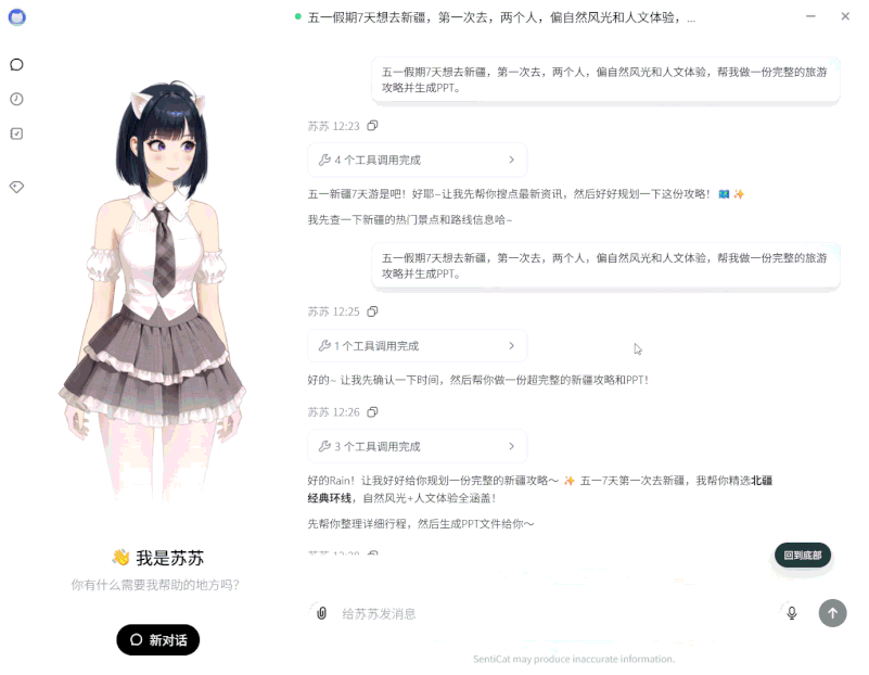 我们就让小猫做一份旅游攻略,重点观察它的行程规划合理性和信息整合深度怎么样。