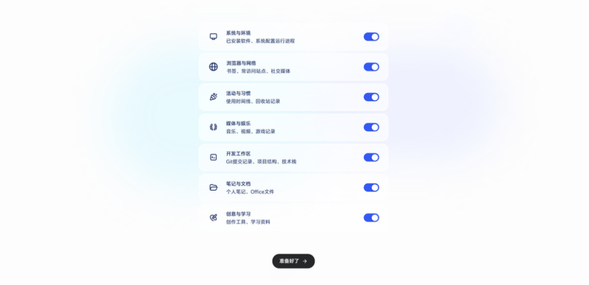 完成授权后,SentiCat就把我的电脑从系统配置、工作区,到浏览器、应用安装,上上下下扫描了一遍。你也可以自己选择授权范围。