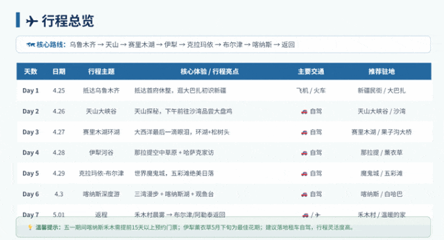 不过,路线规划里还有个小硬伤:Day 5从伊犁跳到克拉玛依再到布尔津,这段距离将近700公里,一天自驾赶下来压力很大。