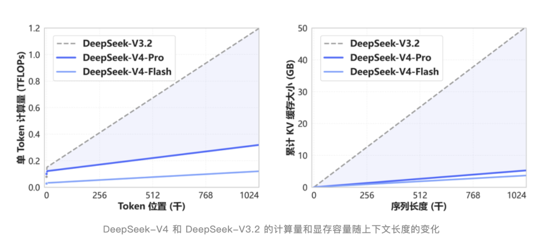 V4开创了一种全新的注意力机制,在token维度进行压缩,结合DSA稀疏注意力一起用。相比传统方法,对计算和显存的需求大幅降低。