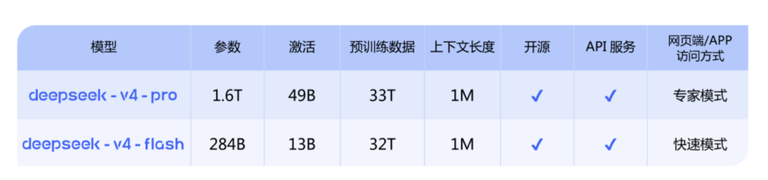 DeepSeek-V4-Pro:对标顶级闭源模型,1.6T,49B激活,上下文长度1M; DeepSeek-V4-Flash:更小更快的经济版,284B,13B激活,上下文长度1M。