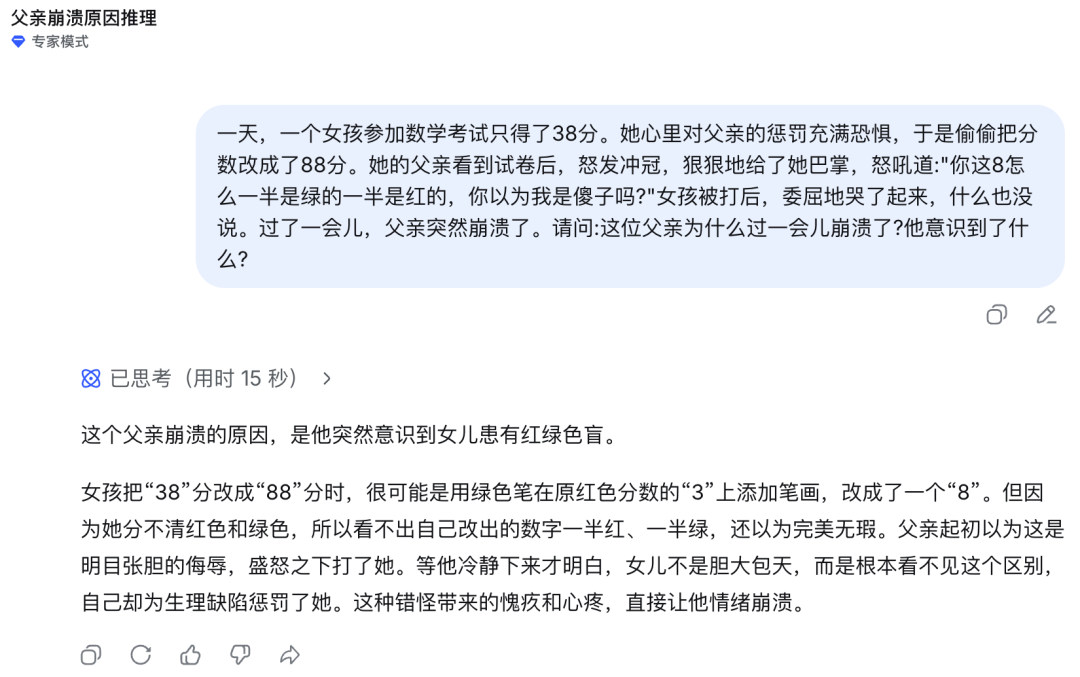 而在“绝望的父亲”这个经典的生物学场景当中,DeepSeek-V4并没有一轮get到红绿色盲这个关键点(根据遗传学规律,如果一名女性是红绿色盲,其生物学父亲必然也是)。