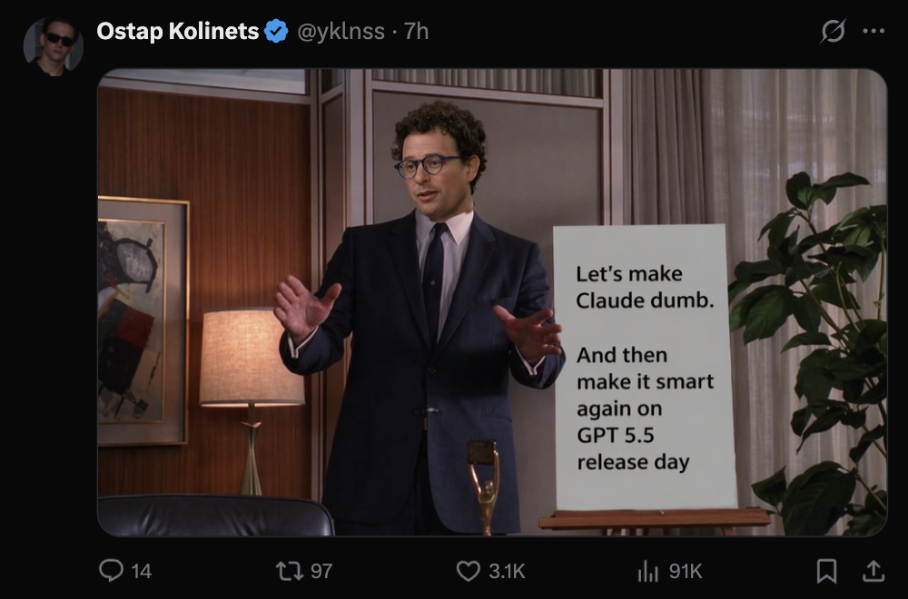 Dario啊,你该不会真的是故意让Claude变笨,好在GPT-5.5放出来的时候找画面的吧?